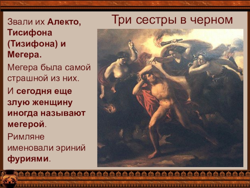 Звали их Алекто, Тисифона (Тизифона) и Мегера.
