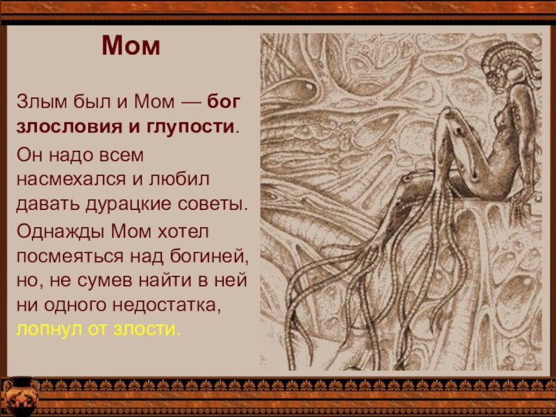 Однажды Мом хотел посмеяться над богиней, но, не сумев найти в ней ни одного недостатка, лопнул от злости.