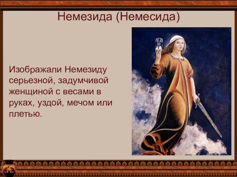 Изображали Немезиду серьезной, задумчивой женщиной с весами в руках, уздой,