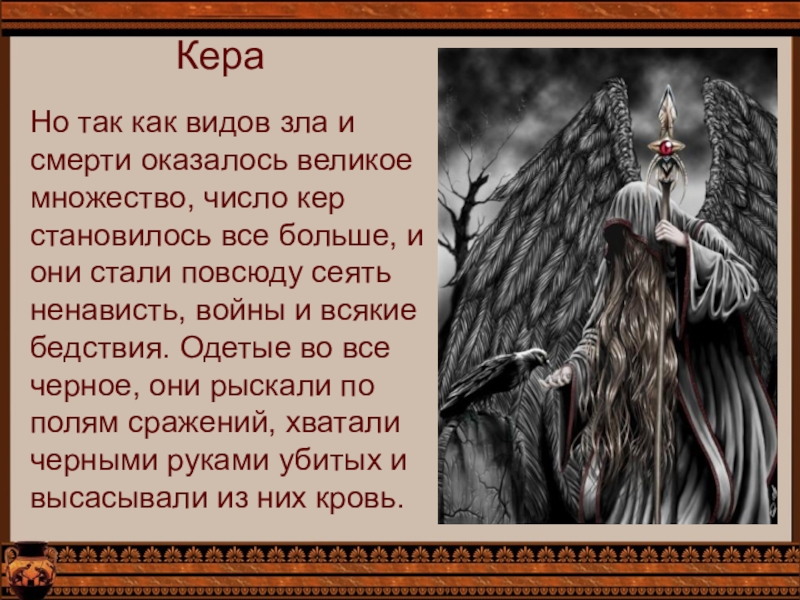 число кер становилось все больше, и они стали повсюду сеять ненависть, войны и всякие бедствия. Одетые во все черное, они рыскали по полям сражений, хватали черными руками убитых и высасывали из них кровь.