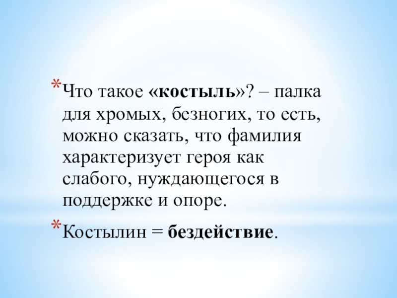 сказать, что фамилия характеризует героя как слабого, нуждающегося в поддержке и опоре.
