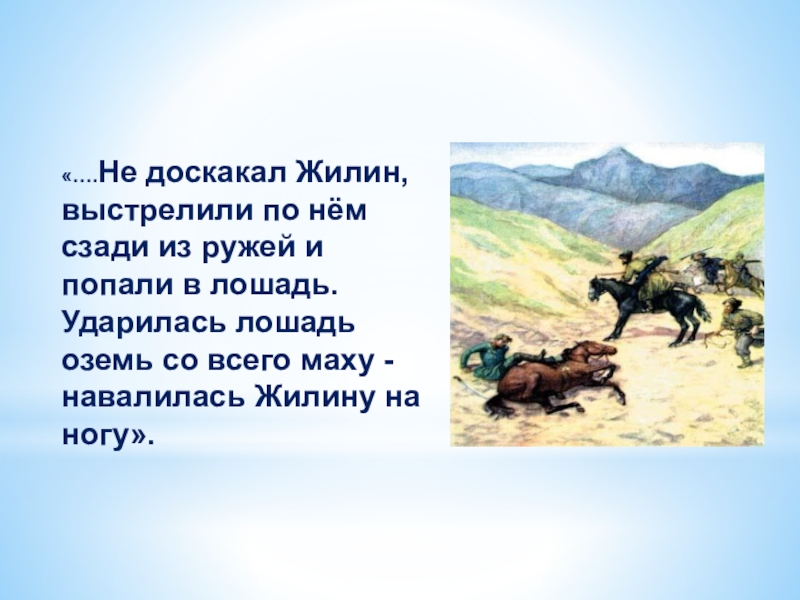 Слайд 13«….Не доскакал Жилин, выстрелили по нём сзади из ружей и попали