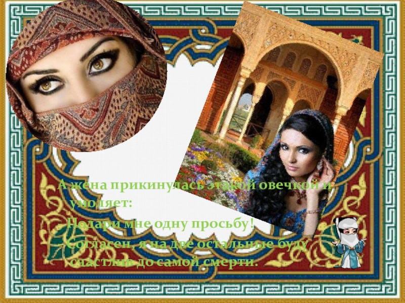 Слайд 13А жена прикинулась этакой овечкой и умоляет: