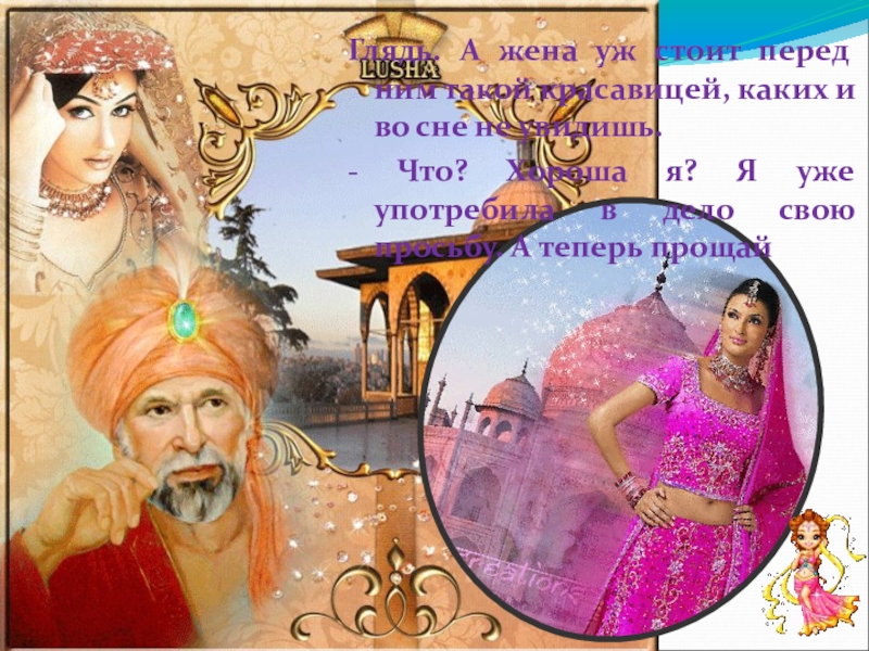 Слайд 14Глядь. А жена уж стоит перед ним такой красавицей, каких и