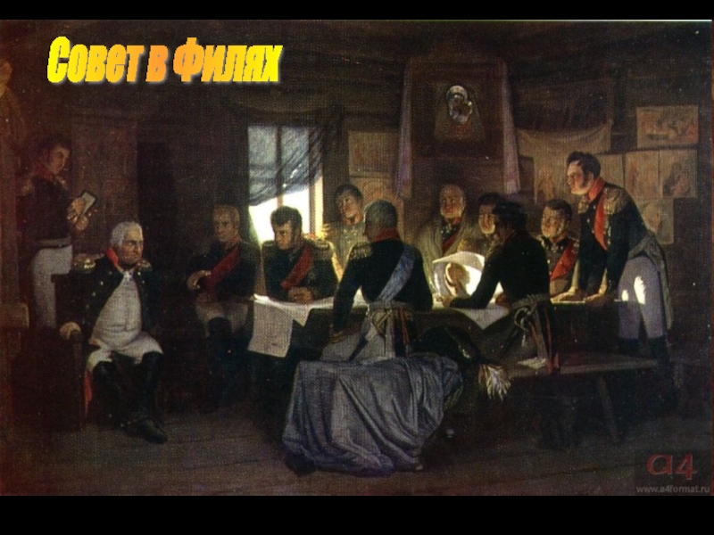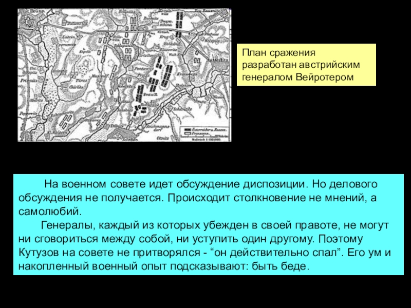 Слайд 17 На военном совете идет обсуждение диспозиции. Но