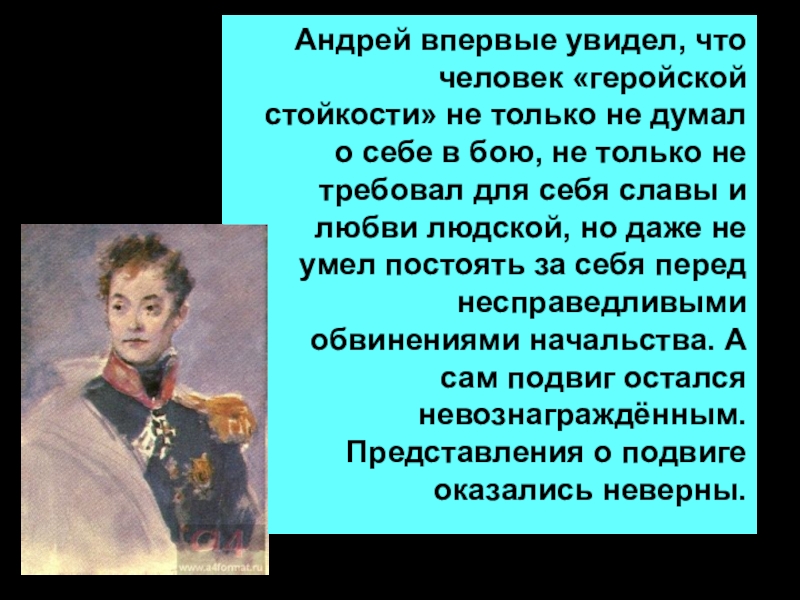 о себе в бою, не только не требовал для себя славы и любви людской, но даже не умел постоять за себя перед несправедливыми обвинениями начальства. А сам подвиг остался невознаграждённым. Представления о подвиге оказались неверны.