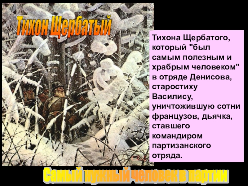 и храбрым человеком" в отряде Денисова, старостиху Василису, уничтожившую сотни французов, дьячка, ставшего командиром партизанского отряда.