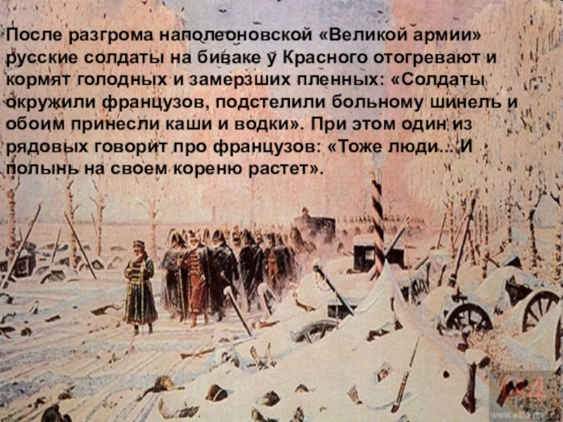 Слайд 48После разгрома наполеоновской «Великой армии» русские солдаты на биваке у Красного
