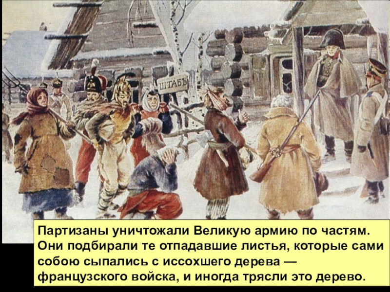 Слайд 44Партизаны уничтожали Великую армию по частям. Они подбирали те отпадавшие листья,