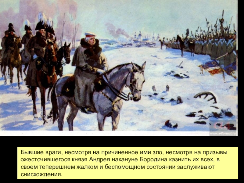 князя Андрея накануне Бородина казнить их всех, в своем теперешнем жалком и беспомощном состоянии заслуживают снисхождения.
