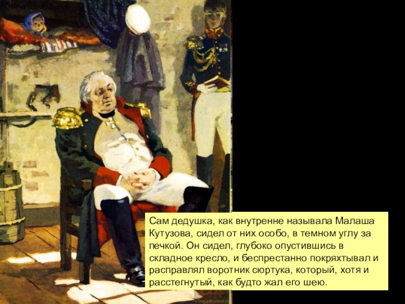 Слайд 39Сам дедушка, как внутренне называла Малаша Кутузова, сидел от них особо,