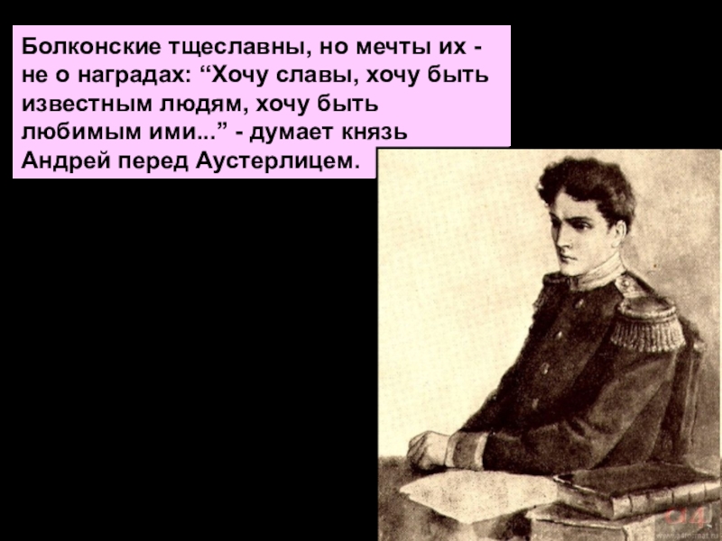 Слайд 18Болконские тщеславны, но мечты их - не о наградах: “Хочу славы,