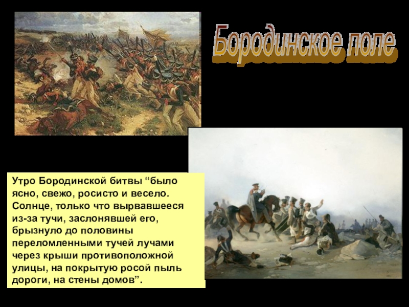 Утро Бородинской битвы “было ясно, свежо, росисто и весело. Солнце,
