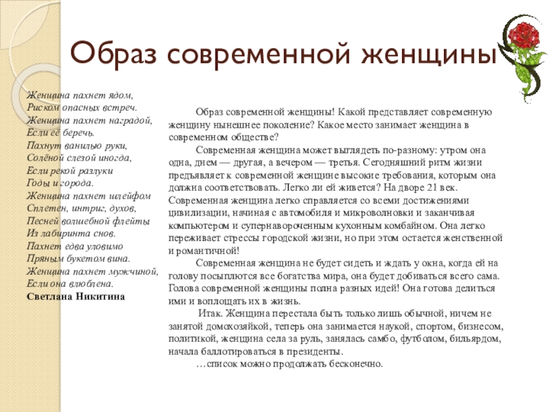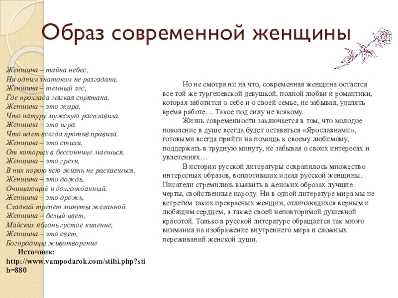 Но не смотря ни на что, современная женщина остается все той же тургеневской девушкой, полной любви и романтики, которая заботится о себе и о своей семье, не забывая, уделять время работе… Такое под силу не всякому.