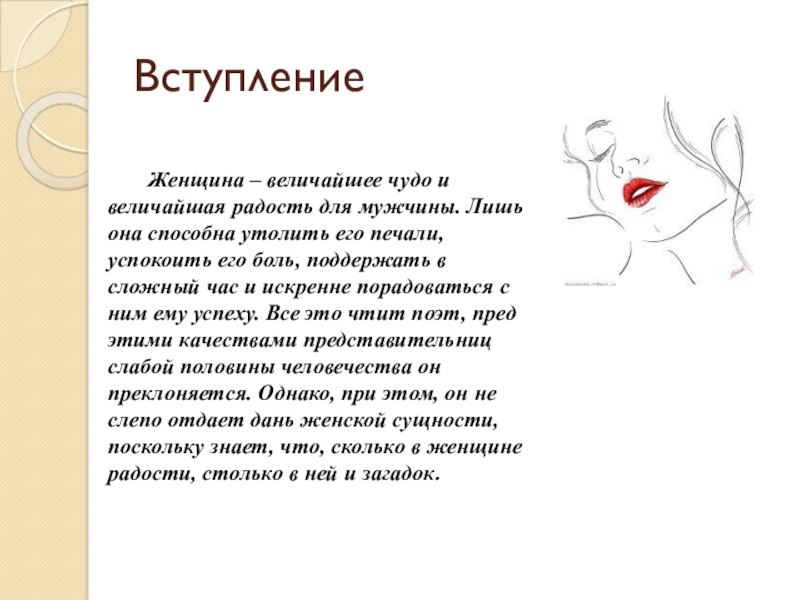 В истории русской литературы сохранилось множество интересных образов, воплотивших идеал русской женщины. Писатели стремились выявить в женских образах лучшие черты, свойственные народу. Ни в одной литературе мира мы не встретим таких прекрасных женщин, отличающихся верным и любящим сердцем, а также своей неповторимой душевной красотой. Только в русской литературе обращается так много внимания на изображение внутреннего мира и сложных переживаний женской души.