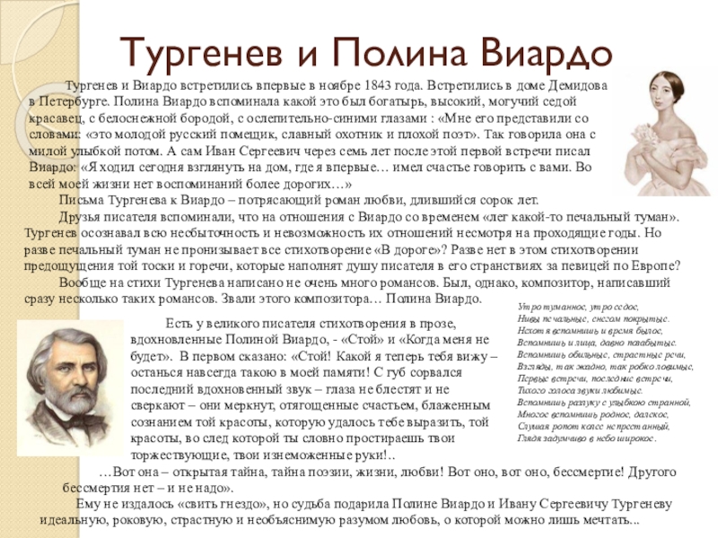 Вообще на стихи Тургенева написано не очень много романсов. Был, однако, композитор, написавший сразу несколько таких романсов. Звали этого композитора… Полина Виардо.