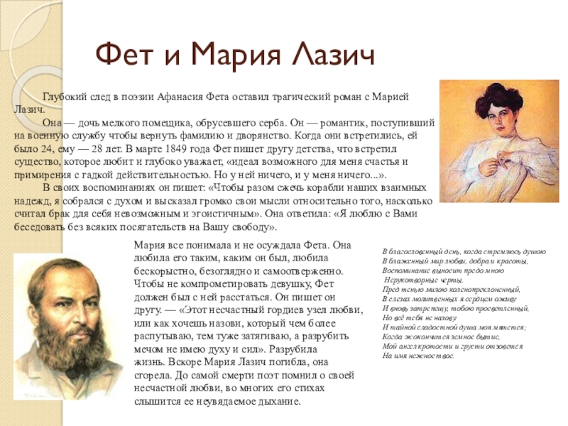 Мария все понимала и не осуждала Фета. Она любила его таким, каким он был, любила бескорыстно, безоглядно и самоотверженно. Чтобы не компрометировать девушку, Фет должен был с ней расстаться. Он пишет он другу. — «Этот несчастный гордиев узел любви, или как хочешь назови, который чем более распутываю, тем туже затягиваю, а разрубить мечом не имею духу и сил». Разрубила жизнь. Вскоре Мария Лазич погибла, она сгорела. До самой смерти поэт помнил о своей несчастной любви, во многих его стихах слышится ее неувядаемое дыхание.