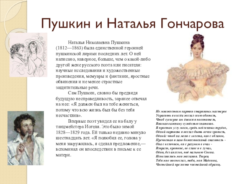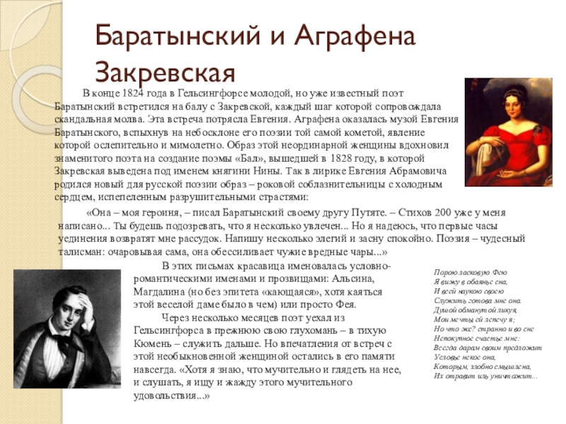 «Она – моя героиня, – писал Баратынский своему другу Путяте. – Стихов 200 уже у меня написано... Ты будешь подозревать, что я несколько увлечен... Но я надеюсь, что первые часы уединения возвратят мне рассудок. Напишу несколько элегий и засну спокойно. Поэзия – чудесный талисман: очаровывая сама, она обессиливает чужие вредные чары...»