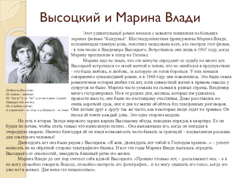 Двенадцать лет она была рядом с Высоцким. «Я жив, двенадцать лет тобой и Господом храним...» – успеет написать он на обратной стороне телеграфного бланка. И все эти годы Марина Влади пыталась оградить Высоцкого от опасностей, замедлить бешеный ритм его жизни.