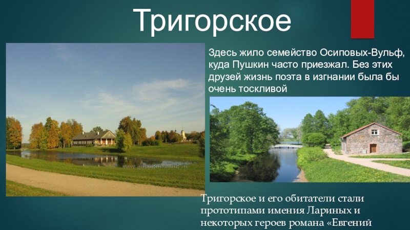 Тригорское и его обитатели стали прототипами имения Лариных и некоторых героев романа «Евгений Онегин»