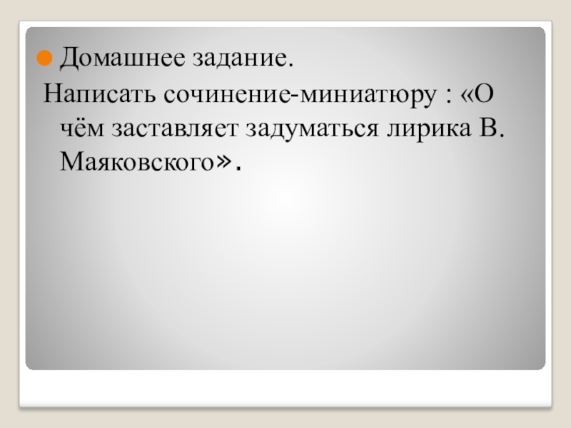 Домашнее задание.Написать сочинение-миниатюру : «О чём заставляет задуматься лирика В. Маяковского».