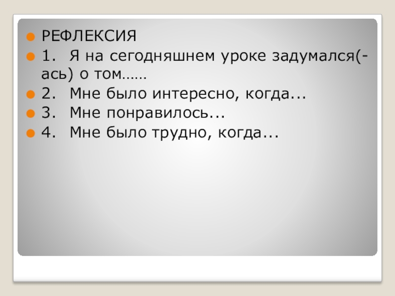 РЕФЛЕКСИЯ1.	Я на сегодняшнем уроке задумался(-ась) о том……2.	Мне было интересно, когда...3.	Мне понравилось...4.	Мне было трудно, когда...