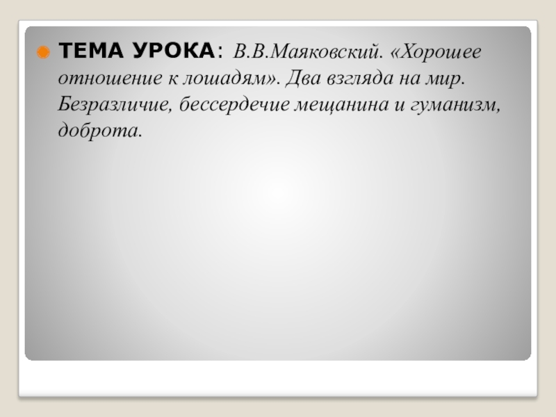 ТЕМА УРОКА: В.В.Маяковский. «Хорошее отношение к лошадям». Два взгляда на мир. Безразличие, бессердечие мещанина и гуманизм, доброта.