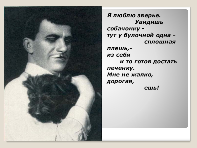 Я люблю зверье.               Увидишь собачонку -тут у булочной одна -                    сплошная плешь,-из себя       и то готов достать
