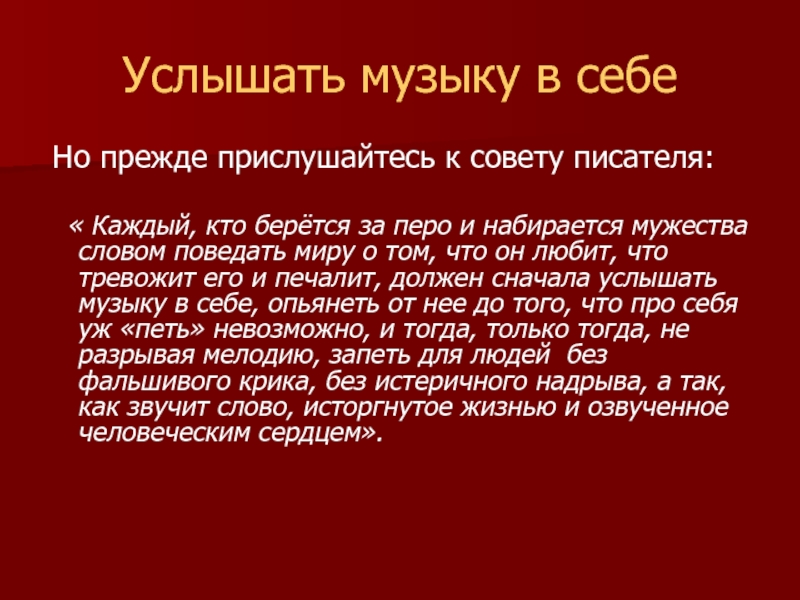 « Каждый, кто берётся за перо и набирается мужества словом поведать миру о том, что он любит, что тревожит его и печалит, должен сначала услышать музыку в себе, опьянеть от нее до того, что про себя уж «петь» невозможно, и тогда, только тогда, не разрывая мелодию, запеть для людей без фальшивого крика, без истеричного надрыва, а так, как звучит слово, исторгнутое жизнью и озвученное человеческим сердцем».