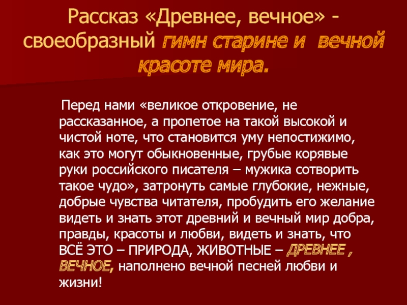 Слайд 36Рассказ «Древнее, вечное» - своеобразный гимн старине и вечной красоте мира.