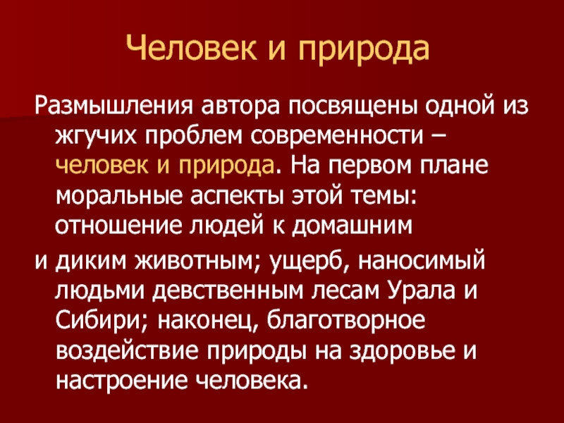и диким животным; ущерб, наносимый людьми девственным лесам Урала и Сибири; наконец, благотворное воздействие природы на здоровье и настроение человека.