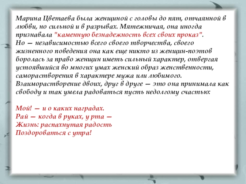 Слайд 8Марина Цветаева была женщиной с головы до пят, отчаянной в любви,