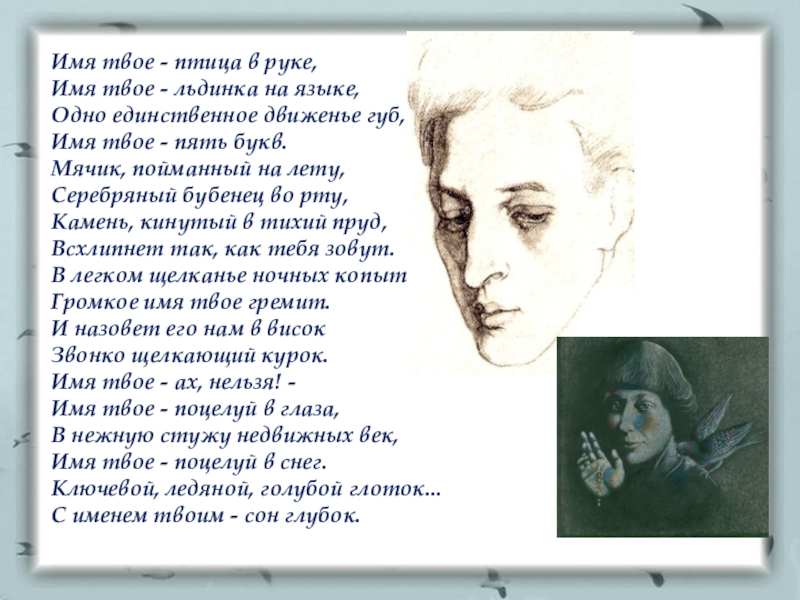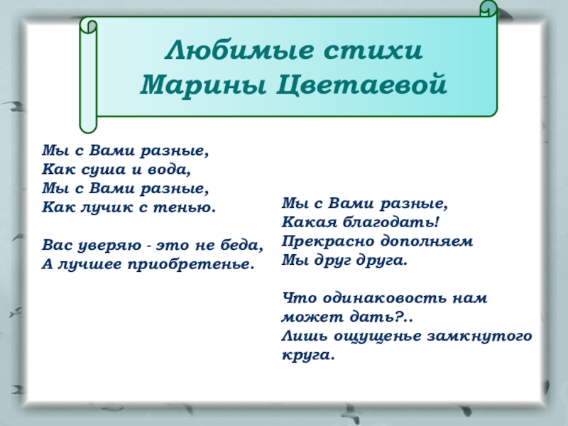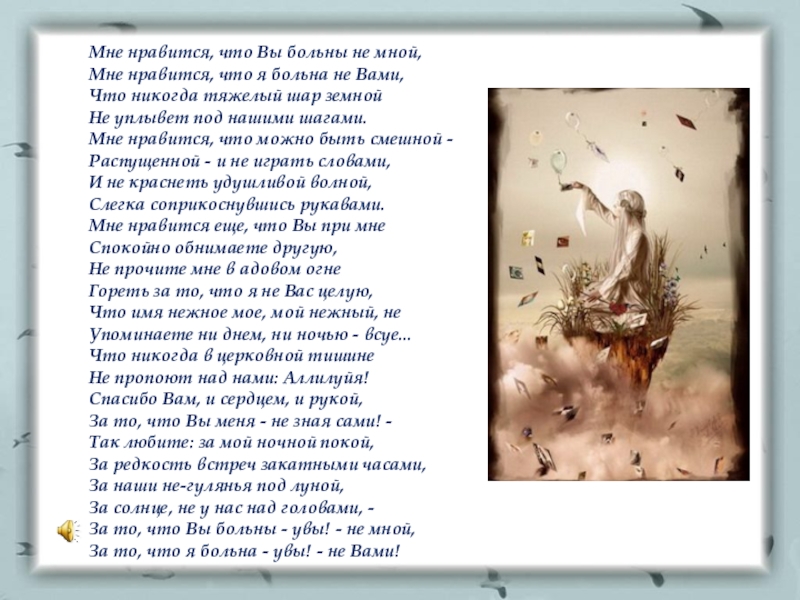лицо перед лицом мужчин. За это ей должны быть благодарны женщины всего мира. Цветаева мощью своего творчества показала, что женская любящая душа — это не только хрупкая свечка, не только прозрачный ручеек, созданный для того, чтоб в нем отражался мужчина, но и пожар, перекидывающий огонь с одного дома на другой.