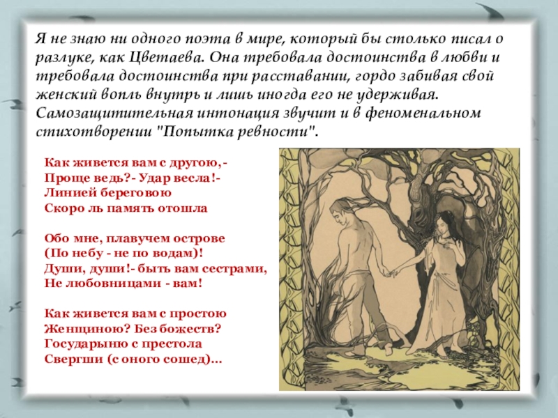 писал о разлуке, как Цветаева. Она требовала достоинства в любви и требовала достоинства при расставании, гордо забивая свой женский вопль внутрь и лишь иногда его не удерживая. Самозащитительная интонация звучит и в феноменальном стихотворении "Попытка ревности".