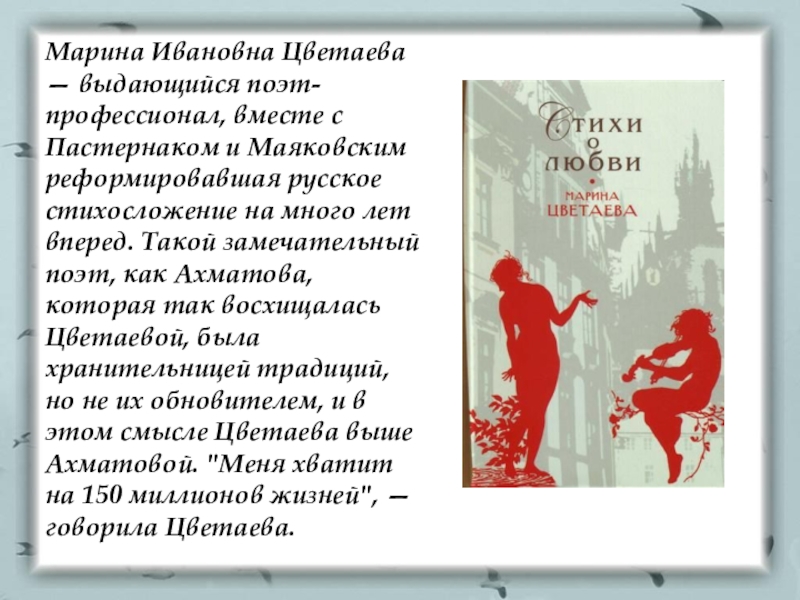 реформировавшая русское стихосложение на много лет вперед. Такой замечательный поэт, как Ахматова, которая так восхищалась Цветаевой, была хранительницей традиций, но не их обновителем, и в этом смысле Цветаева выше Ахматовой. "Меня хватит на 150 миллионов жизней", — говорила Цветаева.