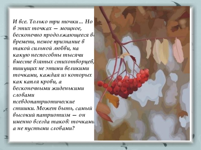 бесконечно продолжающееся во времени, немое признание в такой сильной любви, на какую неспособны тысячи вместе взятых стихотворцев, пишущих не этими великими точками, каждая из которых как капля крови, а бесконечными жиденькими словами псевдопатриотические стишки. Может быть, самый высокий патриотизм — он именно всегда таков: точками, а не пустыми словами?