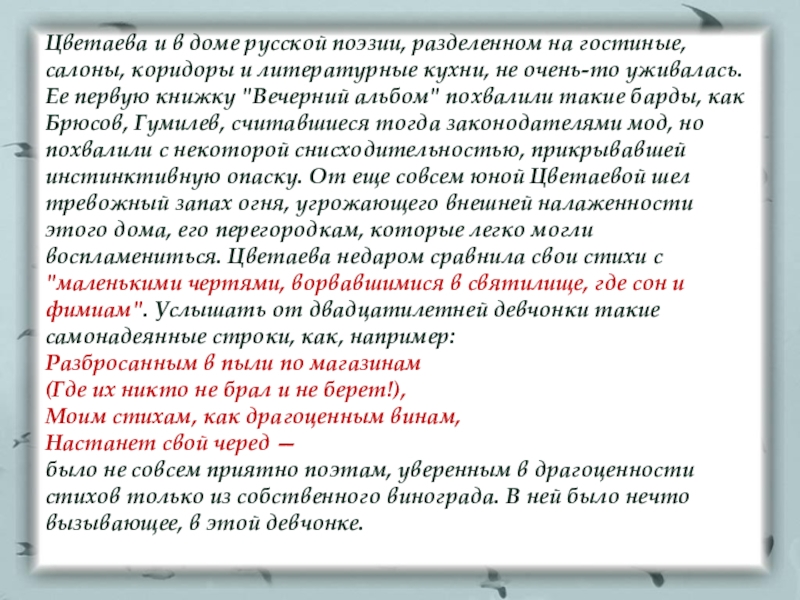 и литературные кухни, не очень-то уживалась. Ее первую книжку "Вечерний альбом" похвалили такие барды, как Брюсов, Гумилев, считавшиеся тогда законодателями мод, но похвалили с некоторой снисходительностью, прикрывавшей инстинктивную опаску. От еще совсем юной Цветаевой шел тревожный запах огня, угрожающего внешней налаженности этого дома, его перегородкам, которые легко могли воспламениться. Цветаева недаром сравнила свои стихи с "маленькими чертями, ворвавшимися в святилище, где сон и фимиам". Услышать от двадцатилетней девчонки такие самонадеянные строки, как, например: