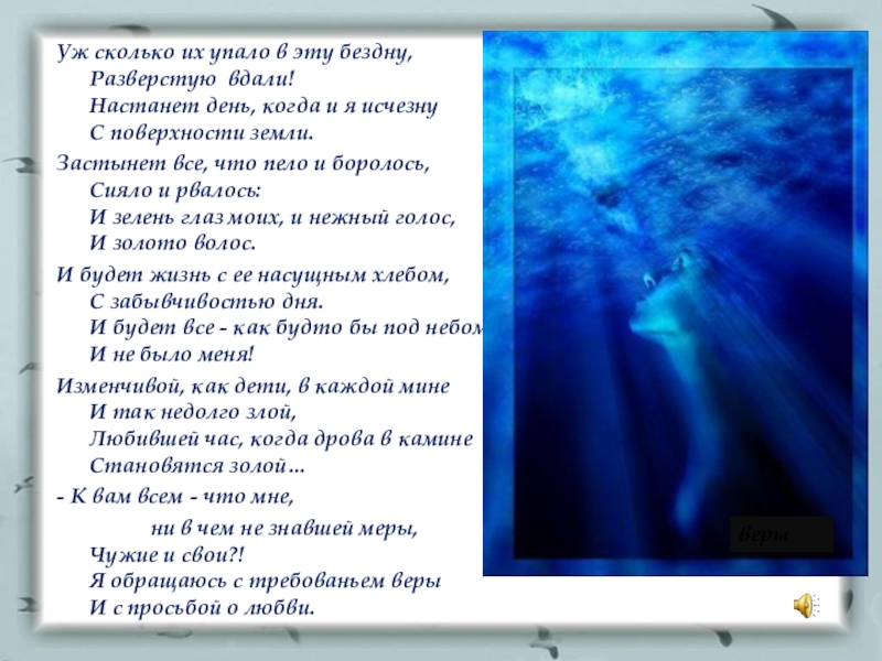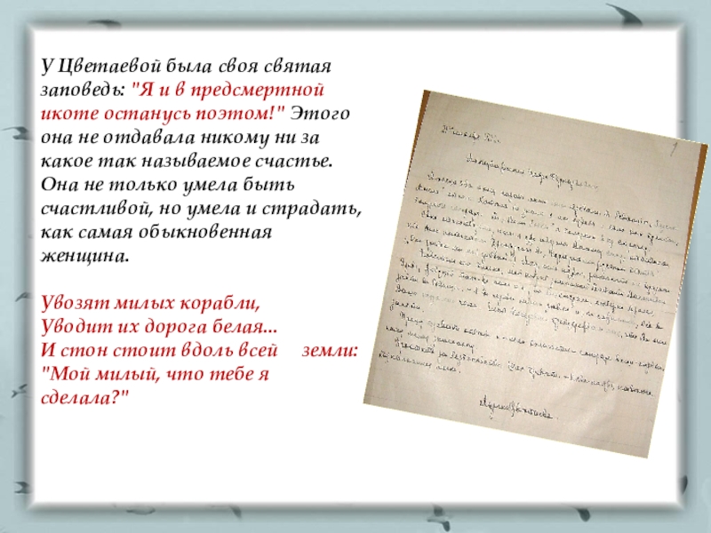 Слайд 9У Цветаевой была своя святая заповедь: "Я и в предсмертной икоте