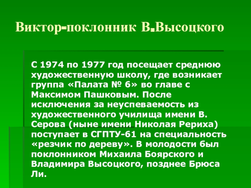 в нашей стране. Цой Виктор Робертович - культовый рок -исполнитель 80-х годов прошлого века, лидер известной группы "Кино".