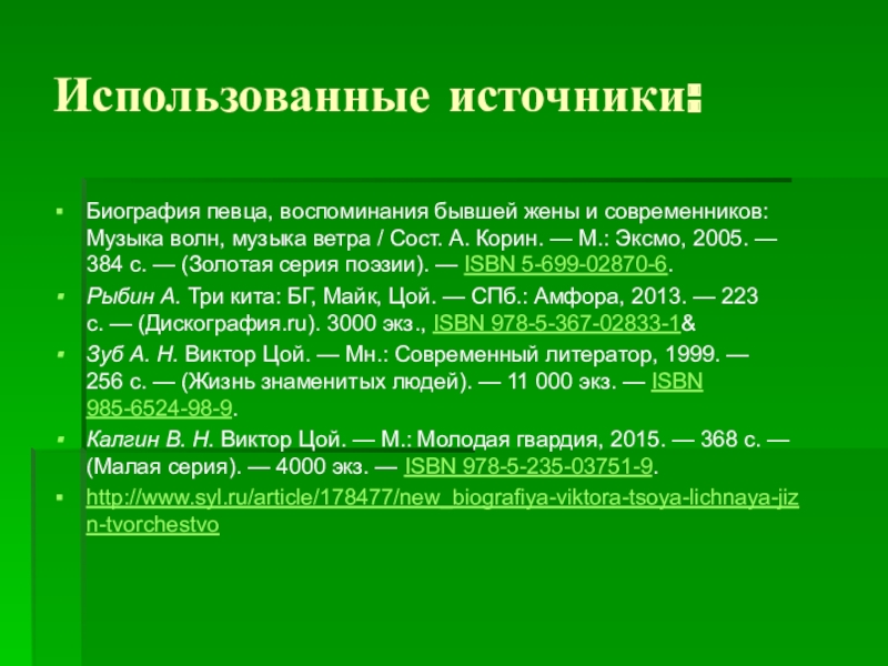 Калгин В. Н. Виктор Цой. — М.: Молодая гвардия, 2015. — 368 с. — (Малая серия). — 4000 экз. — ISBN 978-5-235-03751-9.