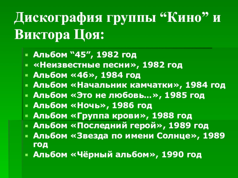 Слайд 10Дискография группы “Кино” и Виктора Цоя: