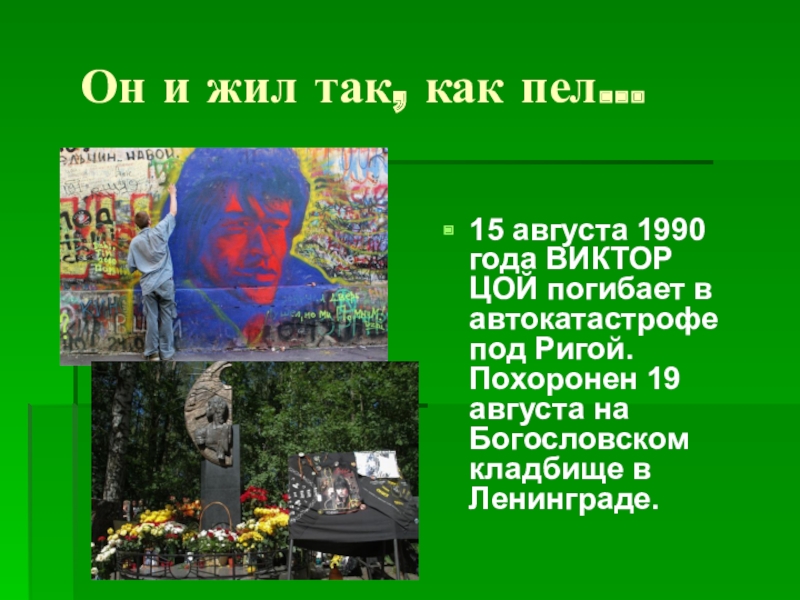 ЦОЙ погибает в автокатастрофе под Ригой. Похоронен 19 августа на Богословском кладбище в Ленинграде.