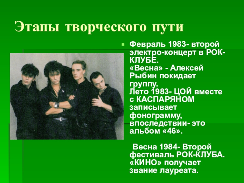 Весна 1984- Второй фестиваль РОК-КЛУБА. «КИНО» получает звание лауреата.