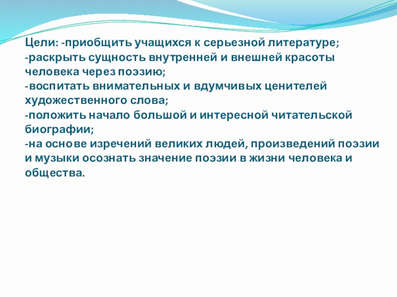 красоты человека через поэзию; -воспитать внимательных и вдумчивых ценителей художественного слова; -положить начало большой и интересной читательской биографии; -на основе изречений великих людей, произведений поэзии и музыки осознать значение поэзии в жизни человека и общества.