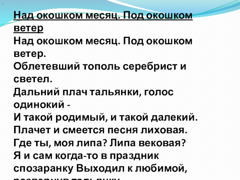 .Над окошком месяц. Под окошком ветерНад окошком месяц. Под окошком ветер.Облетевший тополь серебрист и светел.Дальний плач тальянки,