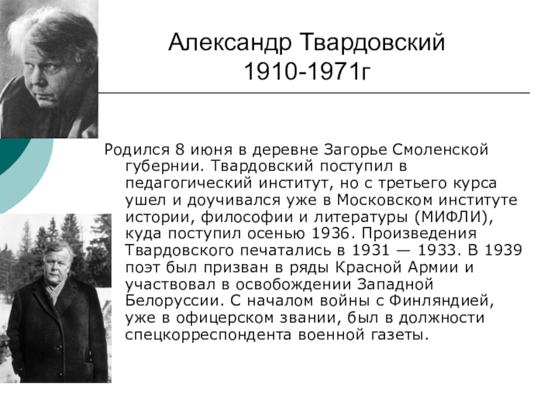 в педагогический институт, но с третьего курса ушел и доучивался уже в Московском институте истории, философии и литературы (МИФЛИ), куда поступил осенью 1936. Произведения Твардовского печатались в 1931 — 1933. В 1939 поэт был призван в ряды Красной Армии и участвовал в освобождении Западной Белоруссии. С началом войны с Финляндией, уже в офицерском звании, был в должности спецкорреспондента военной газеты.