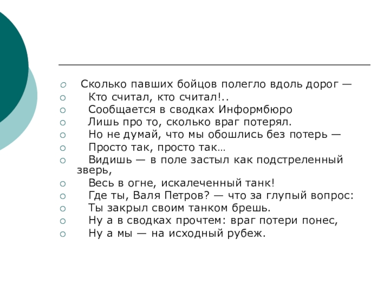 Слайд 14 Сколько павших бойцов полегло вдоль дорог —