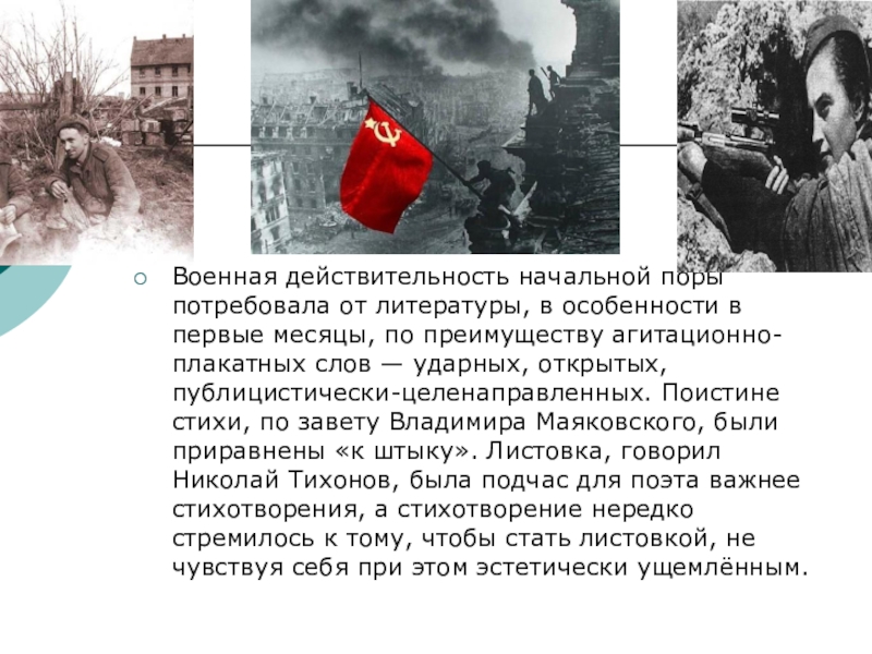 Слайд 4Военная действительность начальной поры потребовала от литературы, в особенности в первые