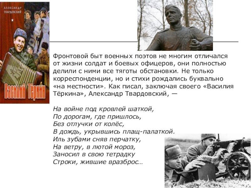 боевых офицеров, они полностью делили с ними все тяготы обстановки. Не только корреспонденции, но и стихи рождались буквально «на местности». Как писал, заключая своего «Василия Тёркина», Александр Твардовский, —