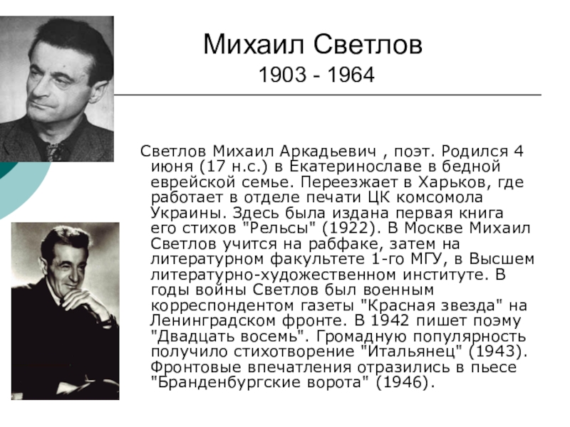 поэт. Родился 4 июня (17 н.с.) в Екатеринославе в бедной еврейской семье. Переезжает в Харьков, где работает в отделе печати ЦК комсомола Украины. Здесь была издана первая книга его стихов "Рельсы" (1922). В Москве Михаил Светлов учится на рабфаке, затем на литературном факультете 1-го МГУ, в Высшем литературно-художественном институте. В годы войны Светлов был военным корреспондентом газеты "Красная звезда" на Ленинградском фронте. В 1942 пишет поэму "Двадцать восемь". Громадную популярность получило стихотворение "Итальянец" (1943). Фронтовые впечатления отразились в пьесе "Бранденбургские ворота" (1946).